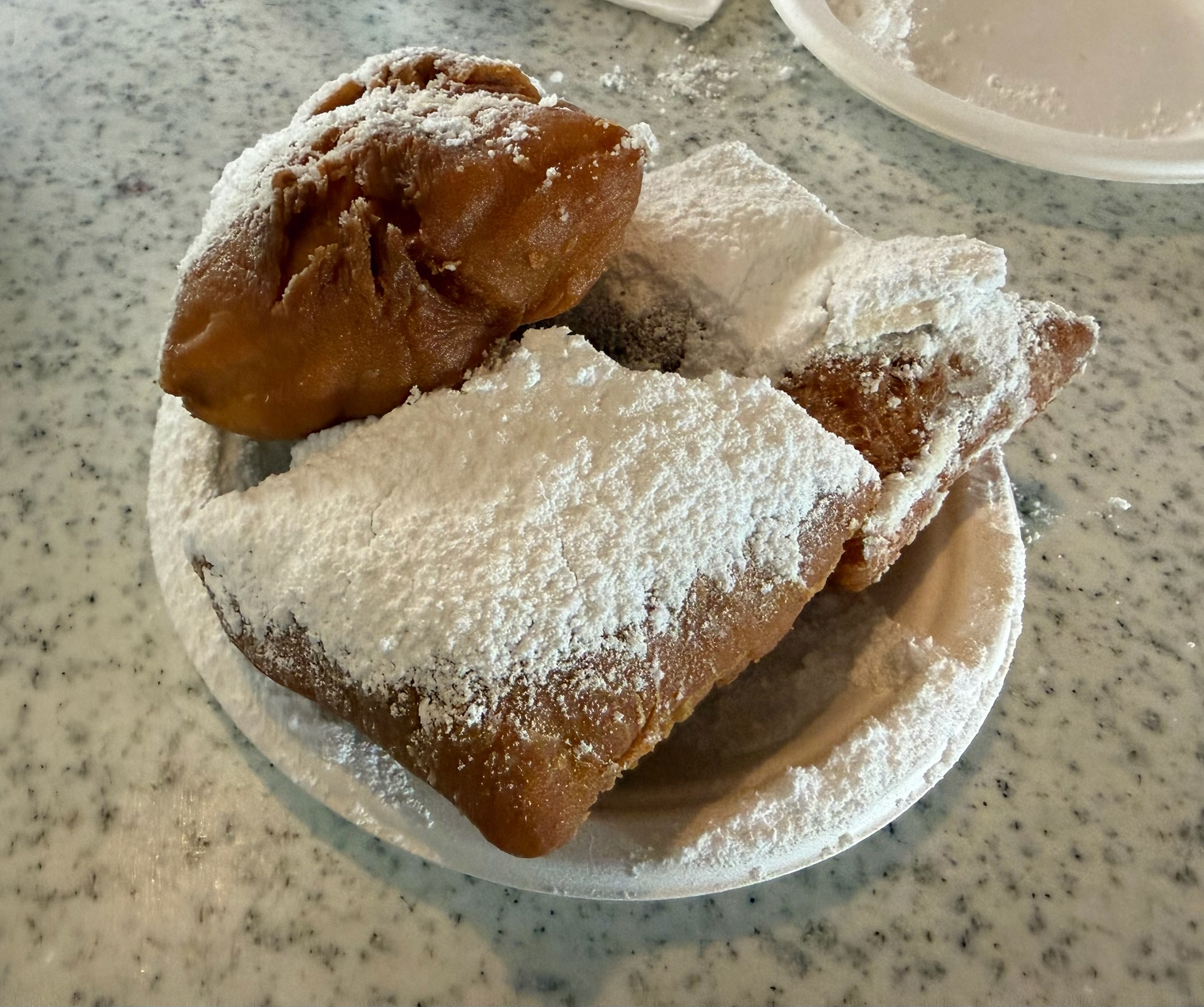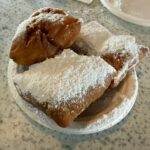 Naturally, the first stop was Café du Monde. If you visit New Orleans and do not eat beignets there, someone may revoke your tourist license. We ordered beignets and water. Beignets are square pieces of fried dough buried under a blizzard of powdered sugar. Café du Monde’s menu is famously simple—beignets and coffee—and they still operate on a cash-only basis. The system has worked since 1862, so I suppose they see no need to complicate things.