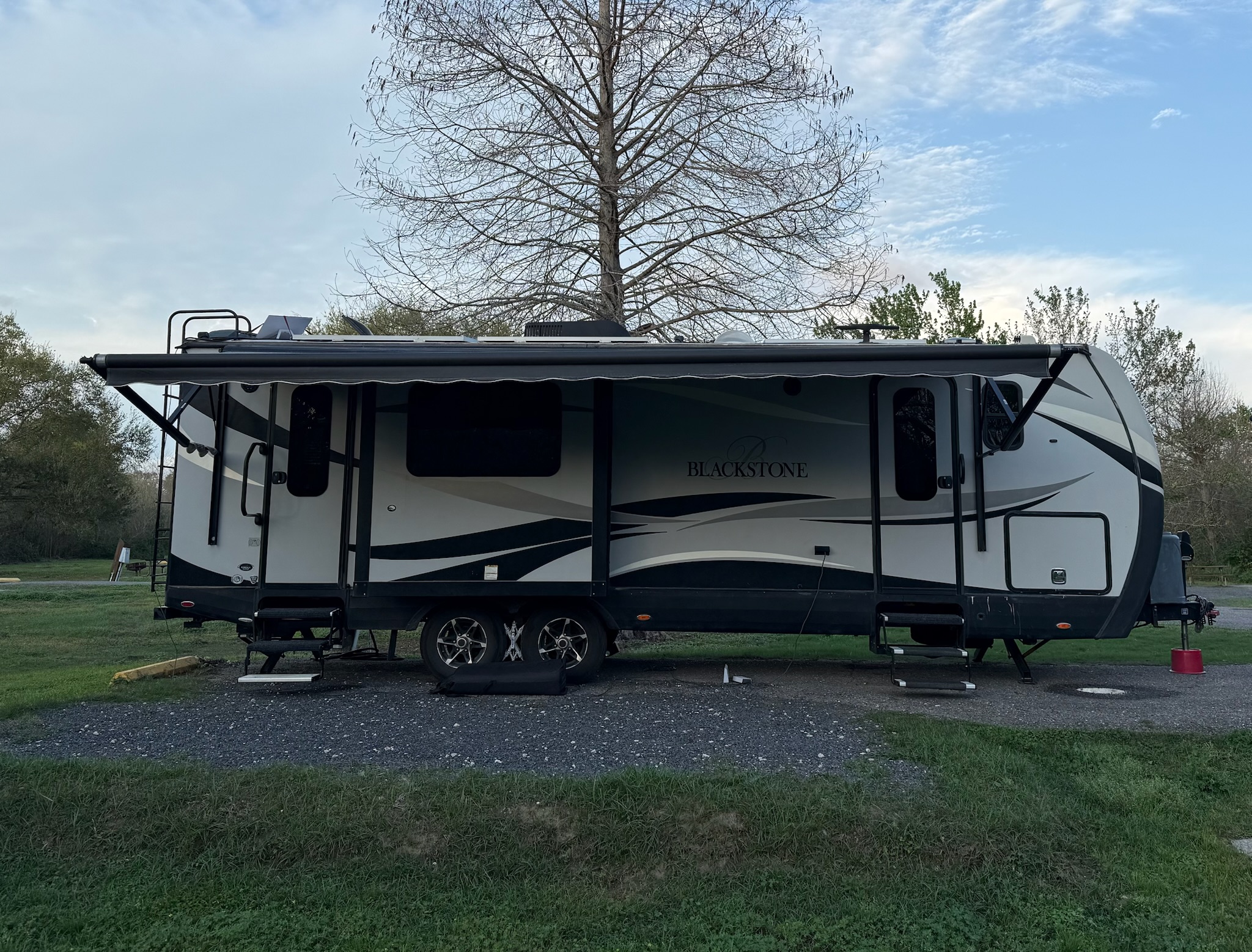 Just behind our site stood a tall radio tower. Mounted on it were what looked to me like a couple of small wireless antennas. I only noticed because when I went to use the wireless remote for lowering the stabilizer jacks, the thing behaved like it had stage fright. Sometimes it worked perfectly. Sometimes it ignored me entirely. My first thought was the battery, so I plugged the remote in and charged it up. The problem seemed to persist, though, and I began to wonder if those antennas were somehow interfering with the signal. It felt a little like parking your RV next to NASA and wondering why your garage door opener suddenly thinks it’s part of a space launch.