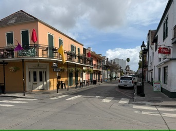 We walked up St. Peter Street to Royal Street, turned right, and strolled for several blocks past galleries, iron balconies, and musicians setting up for the day. Eventually we angled over to Bourbon Street. Visiting Bourbon Street at mid-morning is a completely different experience than the version you see on television at midnight. The street was calm, the balconies were quiet, and the only thing stirring were sober tourists like us.