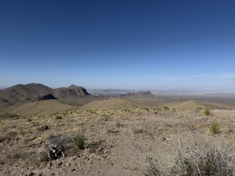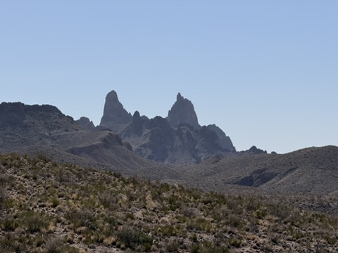 St. Patrick’s Day delivered. We drove into Big Bend and made our first stop at Sotol Vista Overlook. The view opens dramatically into the desert below—layered ridges, distant river, and that vast West Texas scale that makes you feel both small and oddly well-placed. We marked it for sunset and moved on. Along the way we stopped to take a look at the Mule Ears, which have evidently been used by hikers and even pilots for navigation for many decades.