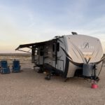 For the next two nights, we selected a truly minimalist camping experience: Chosa Campground. This is Bureau of Land Management (BLM) land, and “campground” might be generous depending on your expectations. Picture several acres of flat gravel in the desert, a large identifying sign, a dumpster, and absolutely no fees. No hookups, no reservations, no frills. And yet, by nightfall, the place develops a quiet sort of community. About twenty RVs arranged themselves loosely around the perimeter, while tent campers migrated just beyond the fenced boundary in search of softer ground. Despite being only about a quarter mile off the highway, it was surprisingly quiet.