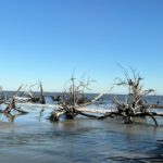 From there, we followed trails along and near the beach—and eventually crossed a pedestrian bridge leading out to a small island where toppled trees littered the shoreline, giving Boneyard Beach its name.
