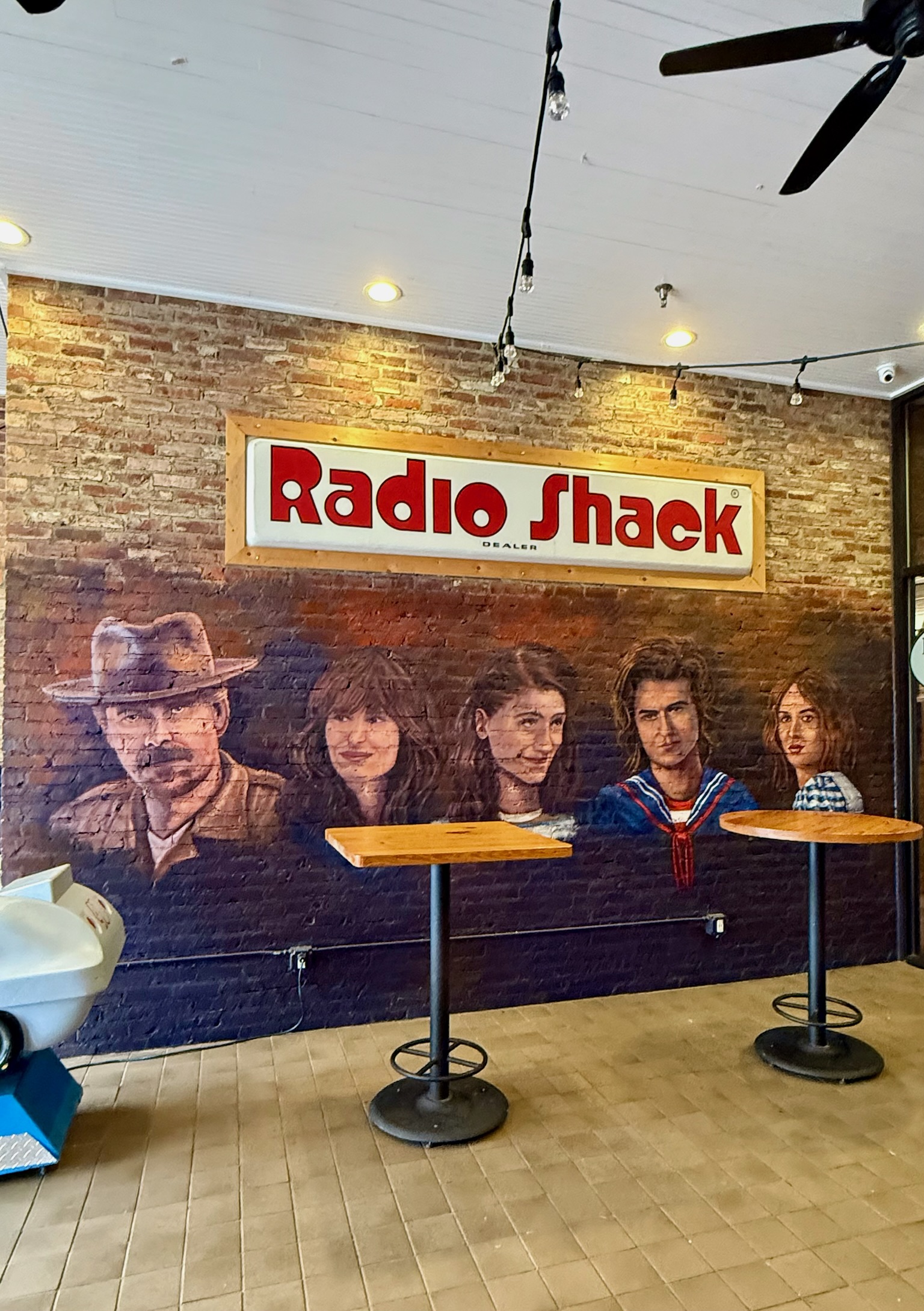 Highlights included artwork of the main characters, props like the iconic Radio Shack sign—ah, the 1980s, when Radio Shack ruled electronics—and a stroll through the Hawkins Library. We capped things off with pizza from the Surfer Dude and a trivia game. Afterward, we poked around the gift shop, tried out the vintage video arcade, and reluctantly departed.