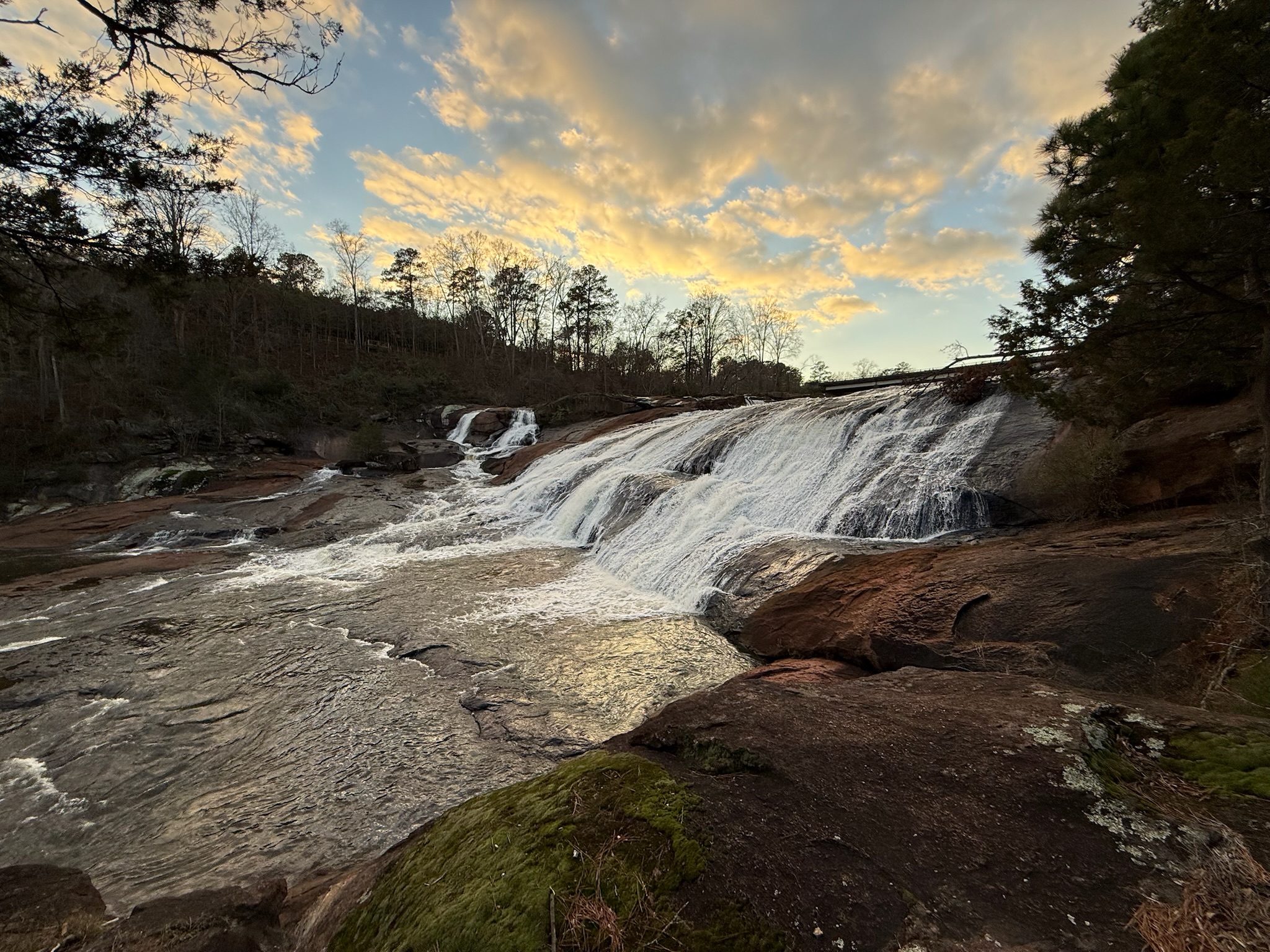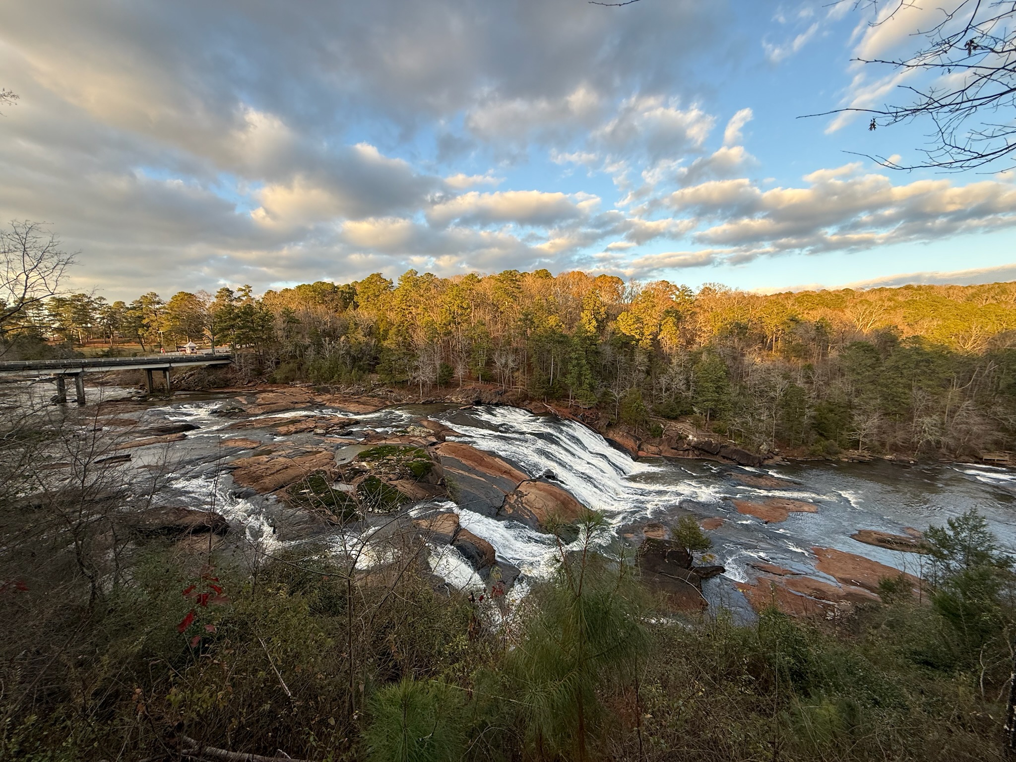 Feeling energized, we next sought some real-world nature and headed 20 minutes to High Falls State Park. The trail from the south side of the river was smooth crushed stone, easy walking—practically a nature sidewalk. Crossing the bridge to the north side, the trail became more adventurous, with stairs, rocks, and the ever-present wet, slippery roots that keep hikers humble. The waterfalls were spectacular, the sun was setting, and we pressed on, delighted to eventually loop back and return to the truck just before dark.
