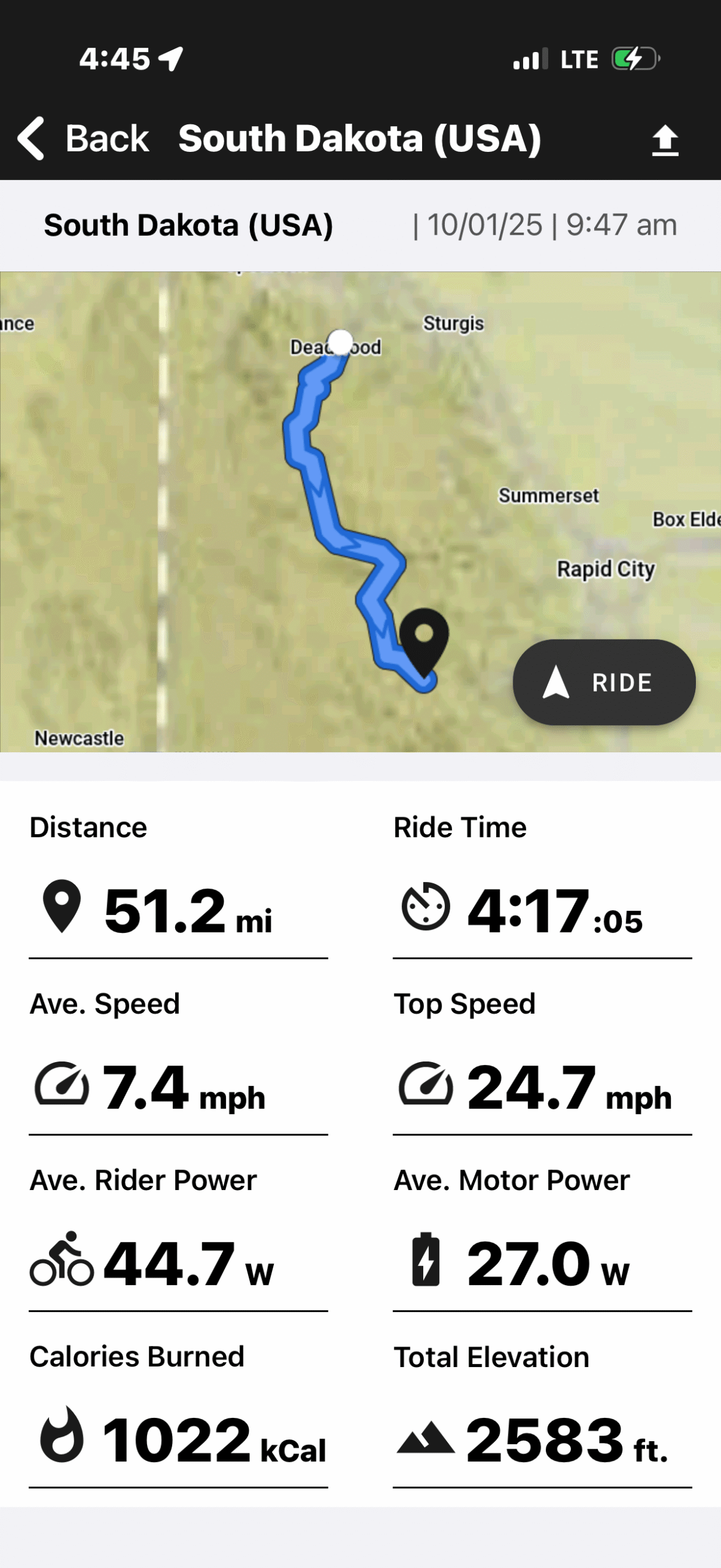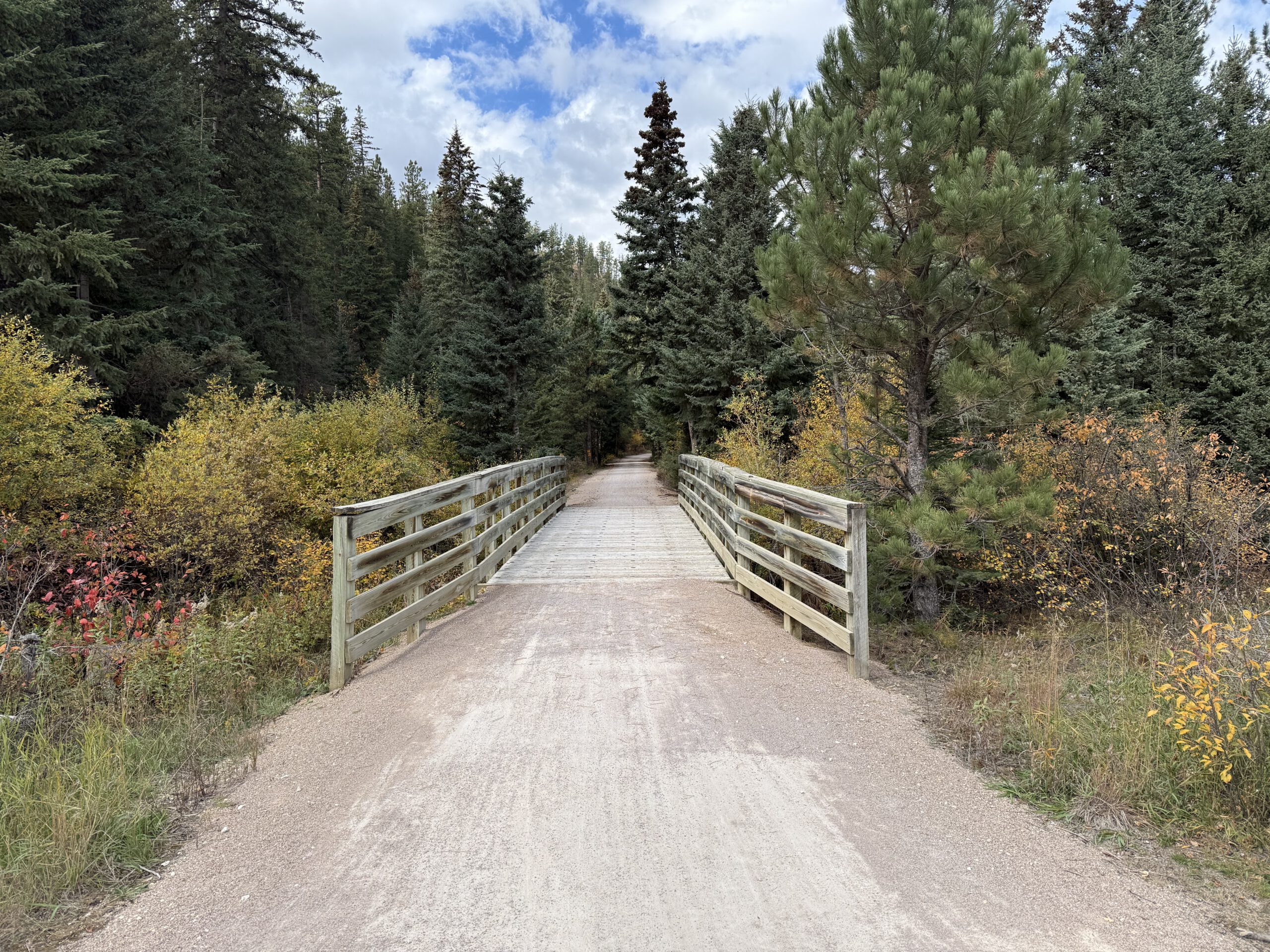 On September 30, 2025, we traveled to Deadwood, South Dakota to take advantage of the unusually wonderful October weather for riding the George S. Mickelson Trail over the next few days. The forecast for October 1 through October 3 was for high temperatures in the 70s and 80s, with only a slight chance of rain on the 1st. The trail is roughly 109 miles long, and we decided to cover it in three days of riding. The map included here was found at https://gfp.sd.gov/userdocs/mickelson-trail-map.pdf