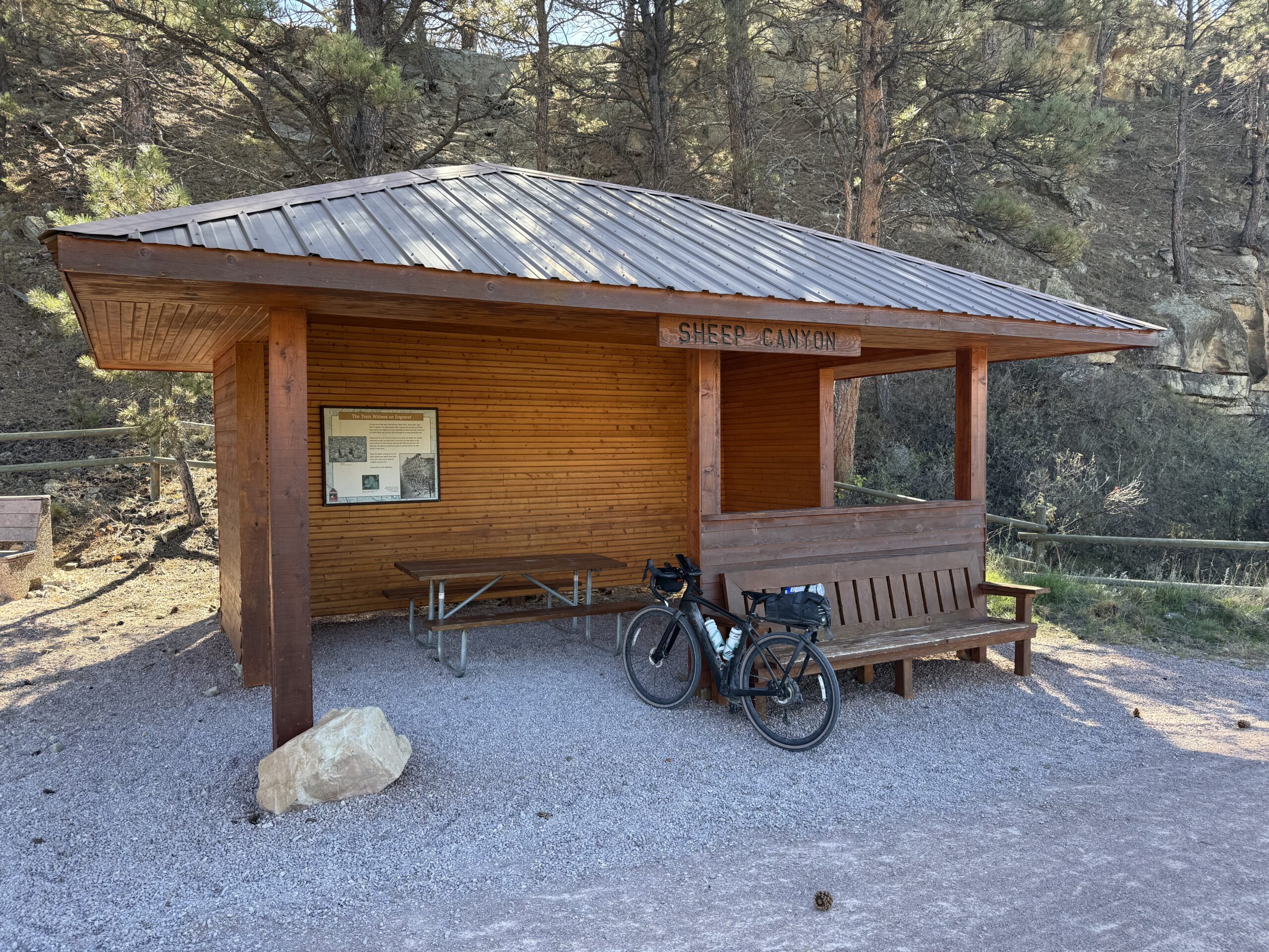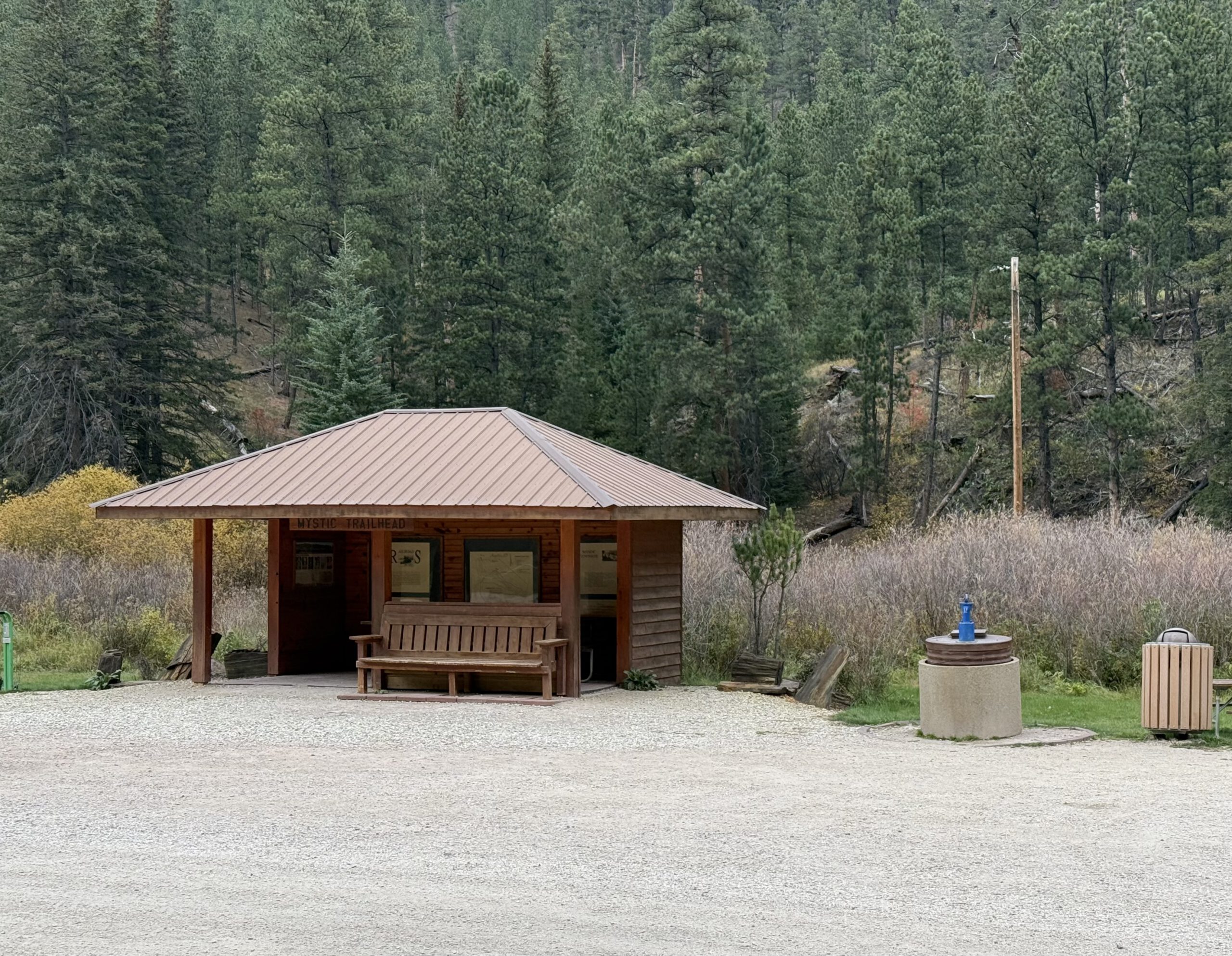 After lunch, the downhill adventure continued for a few miles and then came a gentle climb to Mystic trailhead, pictured to the right. Most of the trailheads along the Mickelson Trail have a shelter, water, and signage, like Mystic. A few of the stops have bike racks and even repair stands. After a brief stop at Mystic, we had a brief climb and then descended into Hill City to end our ride for the day.