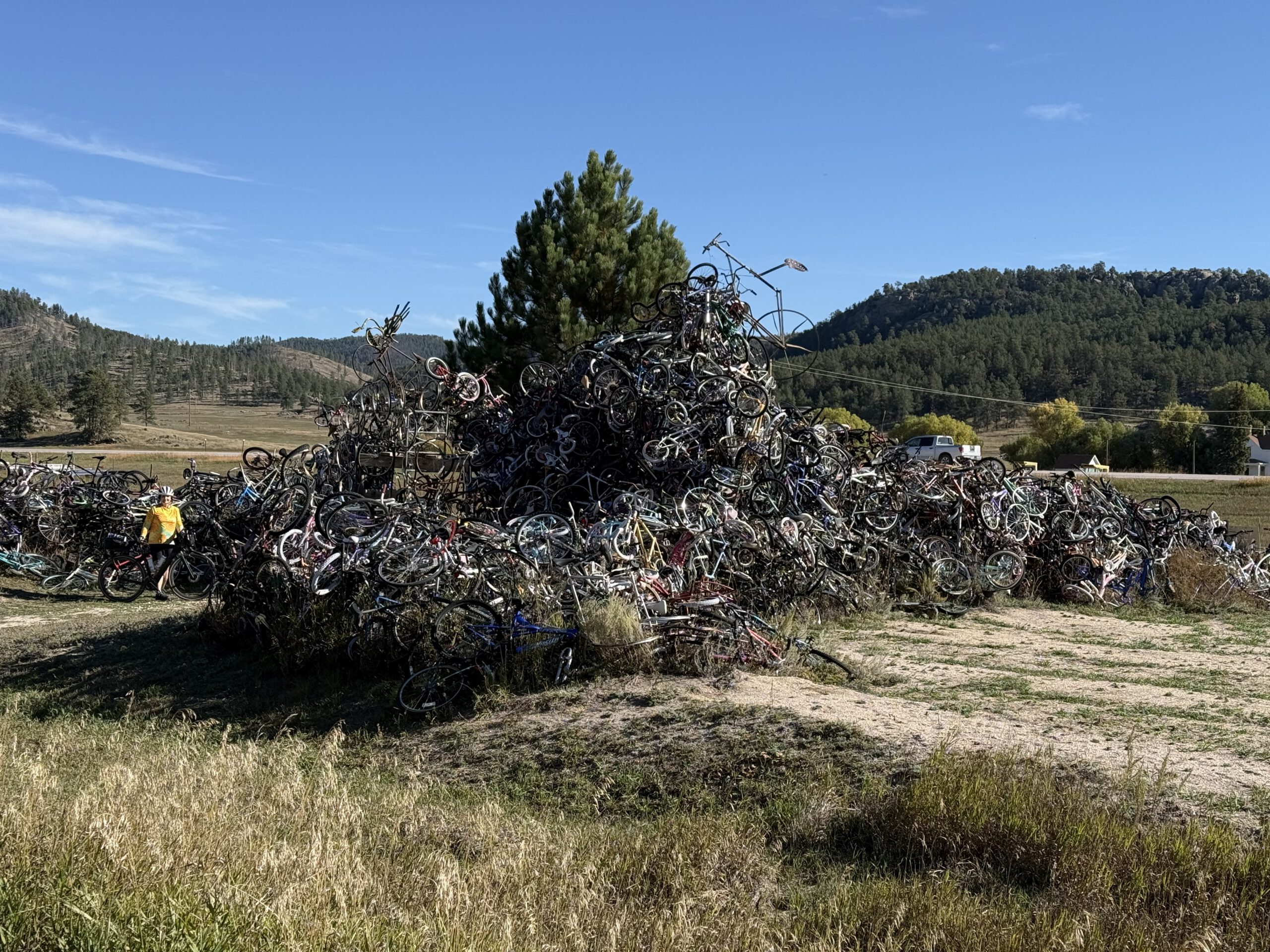 We rose fairly early and were ready to leave by 8 am. At 8, we acquired some provided breakfast items and ate them on our cabin’s front porch. About 9 am we rolled away from Custer. We expected this to be a long, but easy descent. We were a bit surprised with how easy it was. We were often riding at 19 to 20 mph, made possible by the descent and the well-maintained trail. Some say this segment isn’t worth riding, but we disagree. This segment is easy and there are a few interesting things along the way. There is the pile of bikes — who wouldn’t want to see this huge collection of junk bikes? What we can’t figure out is how these got here and who keeps adding bikes. This place isn’t on the way to anywhere, and the local town doesn’t even have a bike shop.
