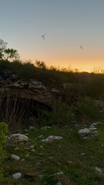We arrived at Parkview around 4:30 p.m., got settled, and then headed back out around six to see something a little unusual. Just a few minutes away is Frio Bat Cave, often called the Concan Bat Cave, home to a massive colony of Mexican free-tailed bats. In the spring and summer hundreds of thousands of bats emerge from the cave each evening to hunt insects across the Hill Country.