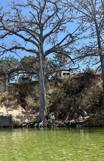 The stretch we paddled is part of the dammed section near Garner State Park, so the current moves slowly and the river spreads into wide, calm pools. The water has a faint green tint, but it is remarkably clear. In many places we could see straight to the rocky bottom. In fact, much of the river is shallow enough that you can wade across in water no deeper than your chest. Bald cypress trees leaned over the banks and limestone outcroppings rose above the water here and there.