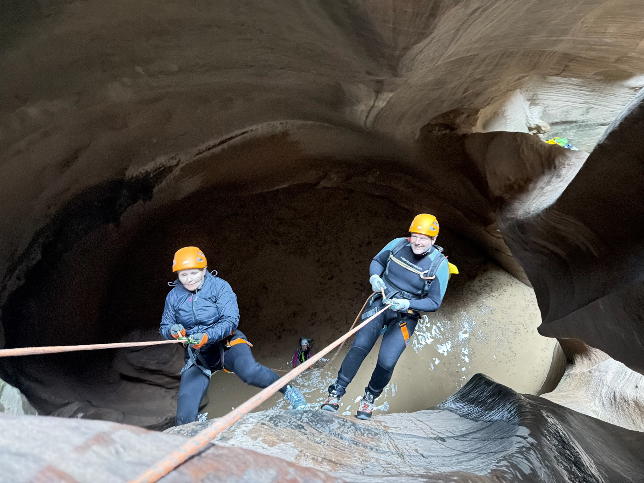 Linda and I, along with ten others, chose to join the second group and descend into Pine Creek Canyon. From the very first step, the adventure was thrilling. We navigated a series of rappels, carefully balanced on boulders, hopped from rock to rock, and waded through chilly pools of water. The canyon demanded attention, patience, and teamwork, but it rewarded us with excitement, laughter, and a sense of accomplishment—we also froze our butts off. The final climb out was short but steep, testing our endurance and leaving us exhilarated… and finally, warm.
